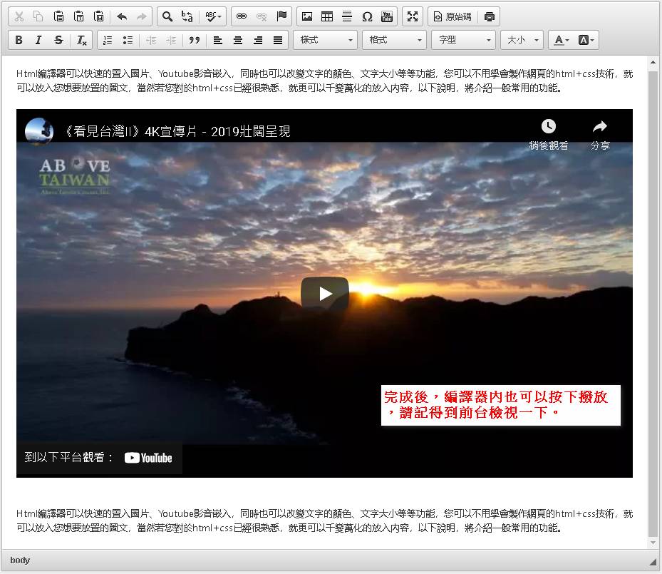 Html編輯器使用說明 2 - 插入Youtube影音的方式